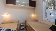 Ihr wohnt in Mobilehomes, die für maximal sechs Personen ausgelegt sind. Sie verfügen über 2 Schlafzimmer (für je 2 Personen), einen Wohn-/Schlafraum (für 2 Personen), DU/WC und eine Veranda mit Tisch und Stühlen. Zudem gibt es einen Kühlschrank und die Klimaanlage ist inklusive.